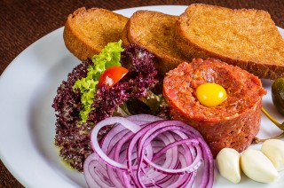 s hovězím ragú, rajčaty, bazalkou a rukolou sypané sýrem Grand Moravia