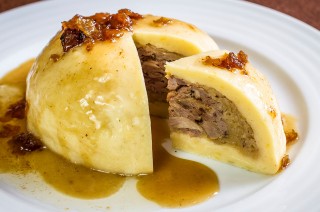 pomalu pečená květová špička na smetaně s domácími houskovými knedlíky a brusinky
